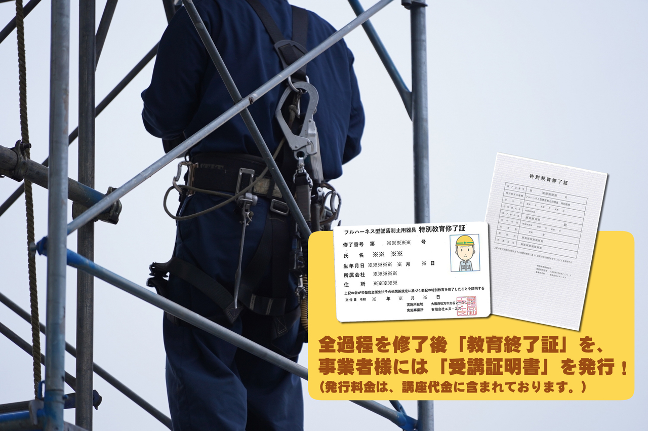 大阪で行われる特別教育の講習では、参加者はフルハーネスを身に着けて安全に参加いただけます。この対面講習では、専門の講師がフルハーネスにおける特別な技術と知識を提供し、参加者が必要なスキルを習得することができます。講習終了後、参加者はその日のうちに修了証を受け取ることができ、習得した能力を証明することができます。大阪で実施しているフルハーネス特別教育の講習では、参加いただく皆様にとって有益な経験となり、安全性を確保しながらスキルアップを図ることができる貴重な機会となっています。